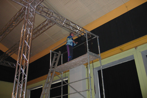 Im Februar wurde die „historisch gewachsene“ Bühnenverkabelung für Licht und Ton durch die Firma ME event technik GmbH & Co. KG professionell erneuert und fachmännisch verlegt. Dazu kamen ein großer Hubwagen, ein Gerüst auf der Bühne und zwei große Lastenstützen zum Einsatz, die die Bühnentraverse trugen.